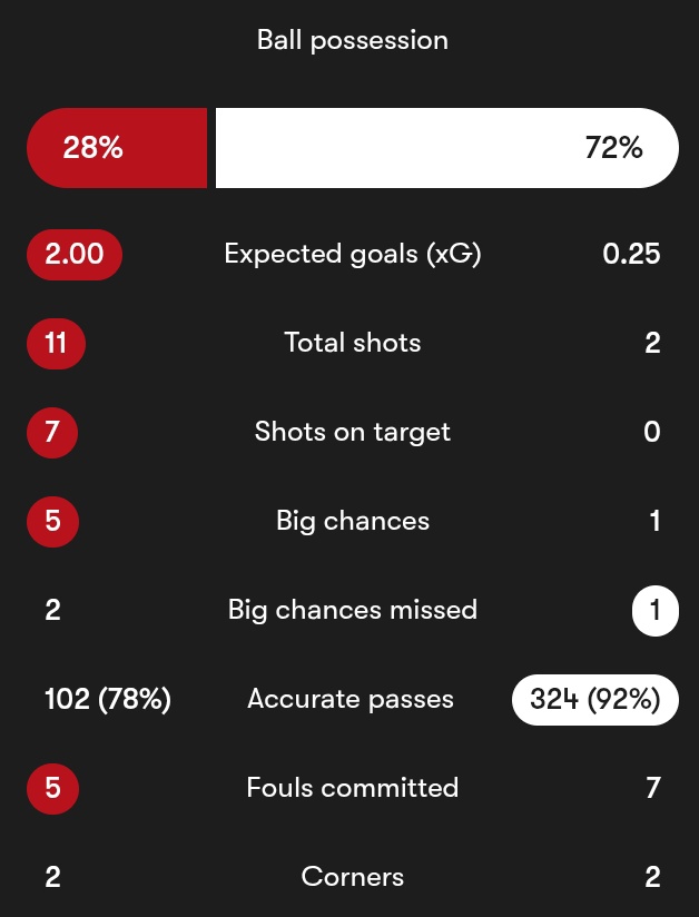 而从半场数据来看,拜仁除了空有控球率和犯规数据之外,其他统计全面落于下风。